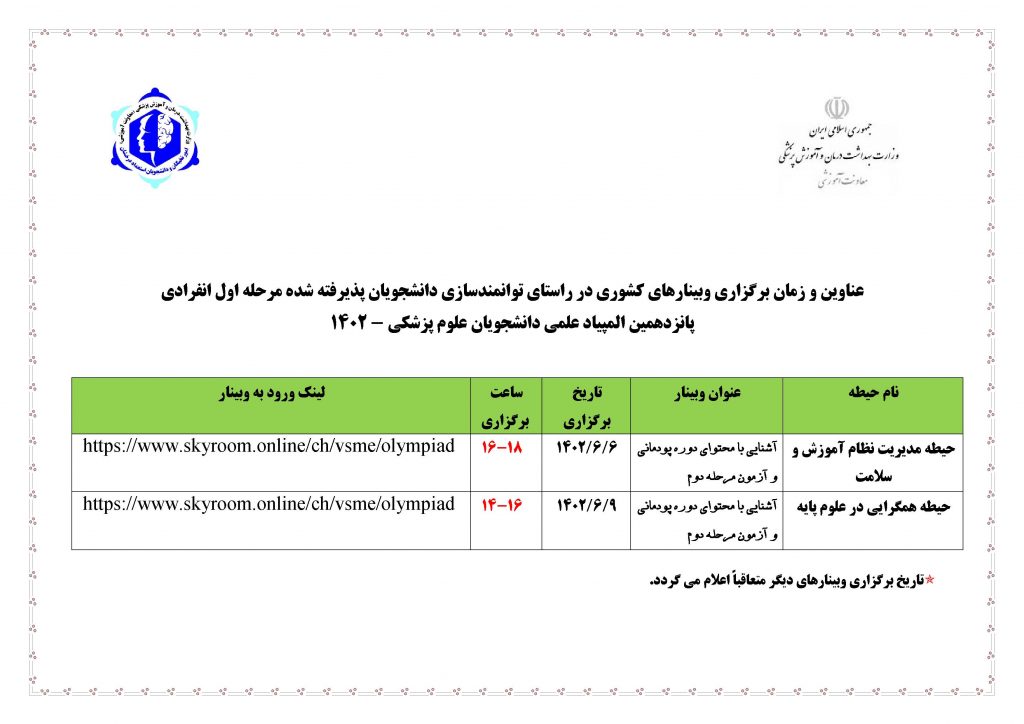 وبینار آشنایی با محتوای دوره پودمانی حیطه مدیریت نظام آموزش و سلامت پانزدهمین المپیاد دانشجویان علوم پزشکی کشور
