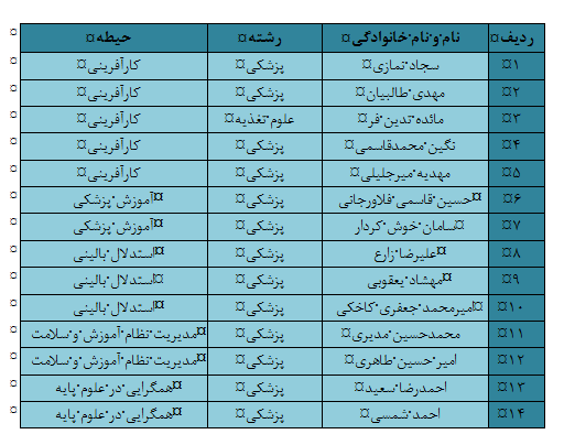 دانشجویان اعزامی به تهران جهت شرکت در مرحله نهایی و مراسم اختتامیه پانزدهمین المپیاد علمی دانشجویان علوم پزشکی کشور از تاریخ اول مهر الی 9 مهر 1402 به شرح جدول ذیل می باشد.