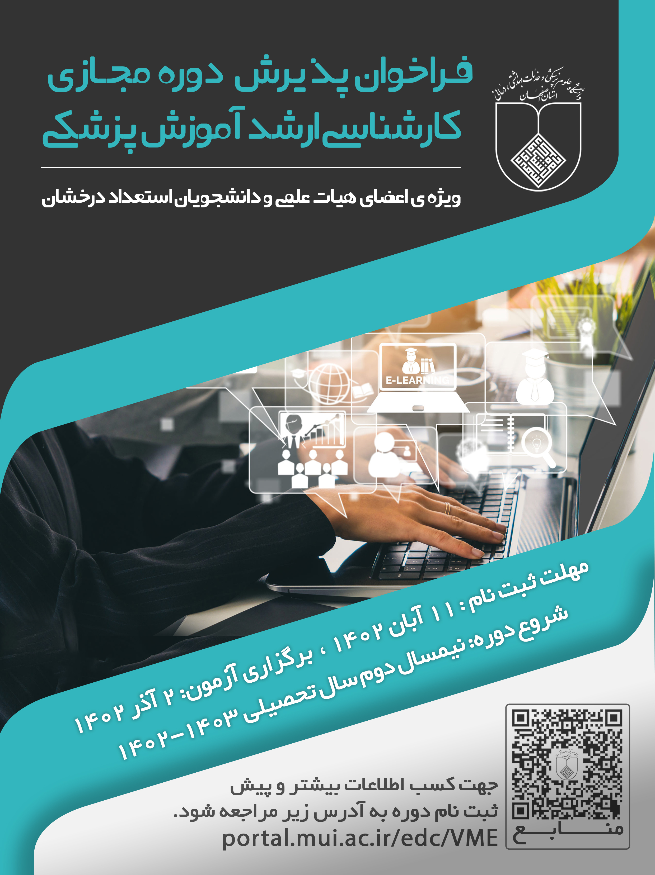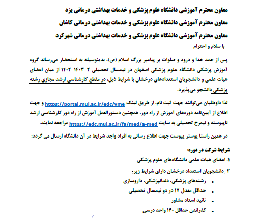 اطلاعیه فراخوان شرکت در رشته مجازی آموزش پزشکی-نیمسال دوم 1403-1402 به صورت ذیل در دسترس می باشد.