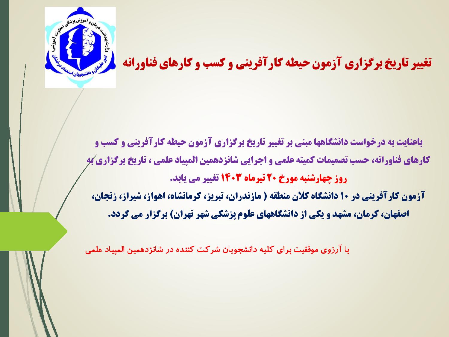 باعنایت به درخواست دانشگاهها مبنی بر تغییر تاریخ برگزاری آزمون حیطه کارآفرینی و کسب و کارهای فناورانه، حسب تصمیمات کمیته علمی و اجرایی شانزدهمین المپیاد علمی ، تاریخ برگزاری آزمون از تاریخ 31 خرداد ماه به تاریخ 20 تیرماه 1403 تغییر می یابد.