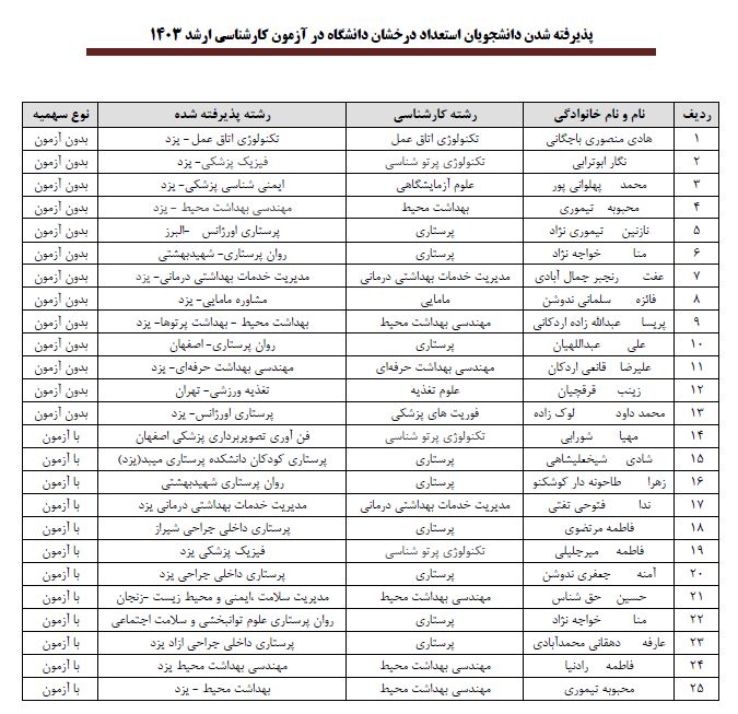 13 نفر از داوطلبین با استفاده از سهمیه بدون آزمون و ۱۲ نفر با استفاده از سهمیه با آزمون پذیرفته شدند.