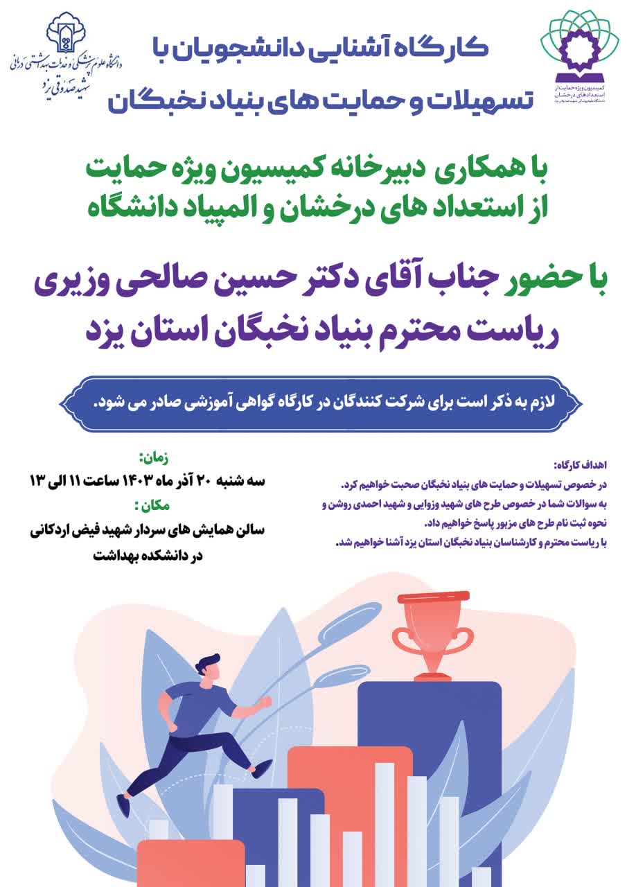 به استحضار می رساند دبیرخانه کمیسیون ویژه حمایت از استعداد های درخشان و المپیاد دانشگاه در نظر دارد کارگاهی با عنوان « آشنایی دانشجویان با تسهیلات و حمایت های بنیاد نخبگان» با حضور جناب آقای دکتر حسین صالحی وزیری، ریاست محترم بنیاد نخبگان استان یزد در روز سه شنبه مورخ ۲۰ آذر ماه ۱۴۰۳ ساعت ۱۱ الی ۱۳  در محل سالن همایش های سردار شهید فیض اردکانی در دانشکده بهداشت برگزار نماید. لذا از تمامی دانشجویان دانشگاه دعوت می شود تا حتما در کارگاه مزبور شرکت نمایند. لازم به ذکر است برای شرکت کنندگان در کارگاه گواهی آموزشی صادر می شود. 🔆 اهداف کارگاه:  *در خصوص تسهیلات و حمایت های بنیاد نخبگان صحبت خواهیم کرد.  *به سوالات شما در خصوص طرح های شهید وزوایی و شهید احمدی روشن و نحوه ثبت نام طرح های مزبور پاسخ خواهیم داد.  *با ریاست محترم و کارشناسان بنیاد نخبگان استان یزد آشنا خواهیم شد.