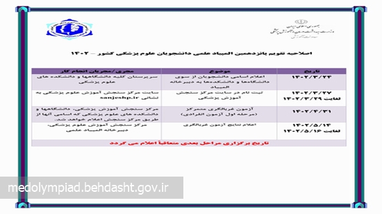 تغییر تقویم زمان بندی برگزاری مرحله اول انفرادی پانزدهمین المپیاد علمیروابط عمومی مرکز31 اردیبهشت 1402به اطلاع می رساند که جدول تقویم زمان بندی مرحله اول انفرادی(غربالگری) پانزدهمین ... اطلاعات بیشتر